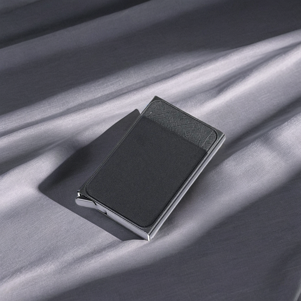 Minimalistische kaarthouder met RFID-bescherming. Handig pop-up mechanisme en stevig metalen ontwerp.
